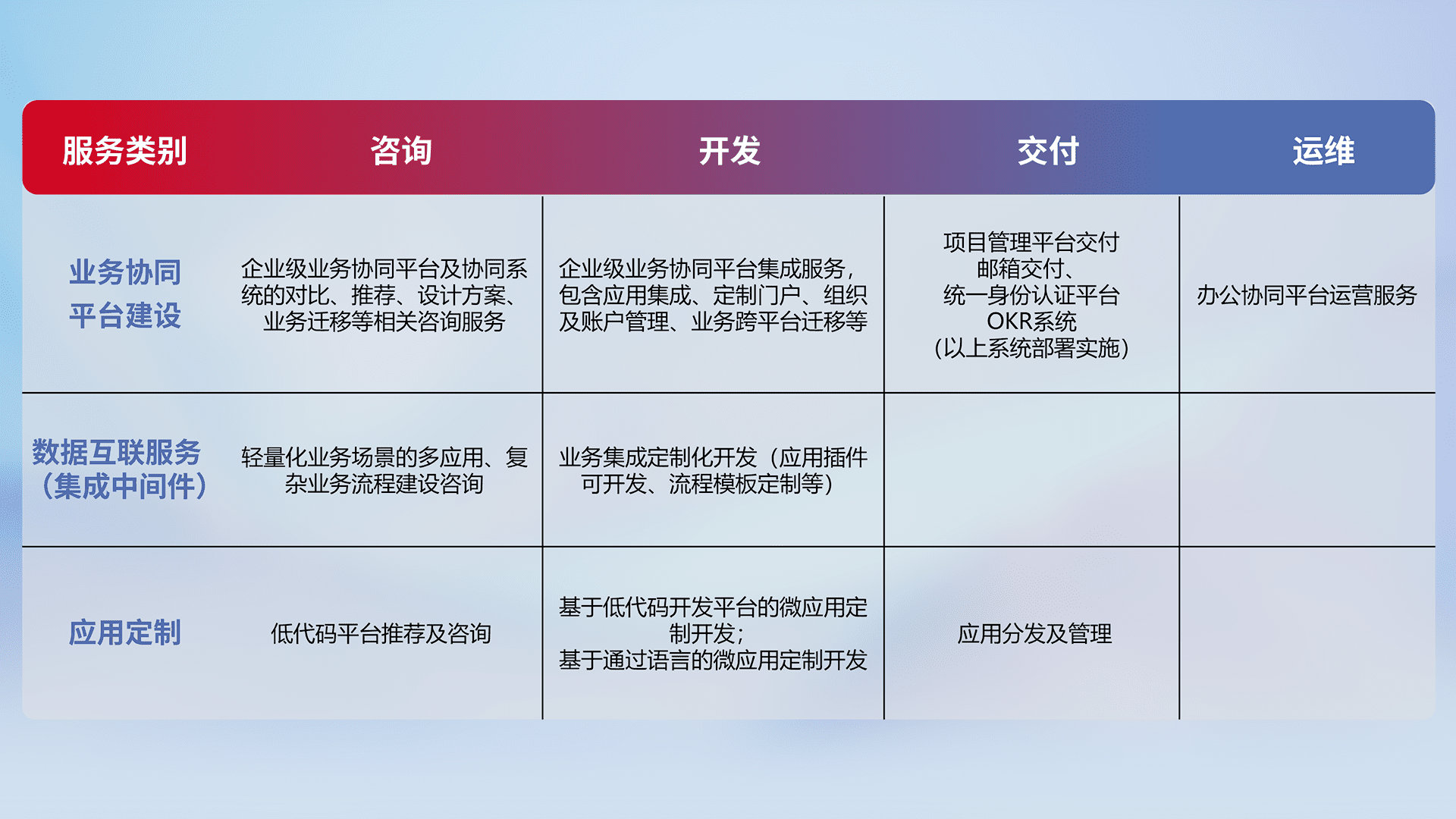 针对钉钉、、、、企微、、IDaas等平台级产品提供产品的规划、、、、方案、、、交付、、、定制化开发等服务,,实现如统一协同办公、、、、智能客户服务、、混合会议管理、、智能数据查询、、、等业务场景,,,实现数字化转型。。